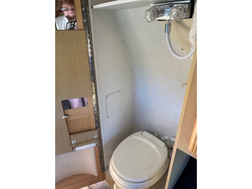 The interior is thoughtfully designed to sleep 2–3 people, featuring a rear dinette that converts into a king-size bed or two twin beds, with an optional front fold-down bed for a third sleeper. The kitchenette includes a 2-burner propane stovetop, sink, microwave, and a 3-way refrigerator (3.0 cu ft, 12V/110V/propane), with Corian countertops and maple cabinetry in pristine condition. The wet bath combines a marine toilet, sink, and handheld shower, with an inside/outside shower option for versatility.