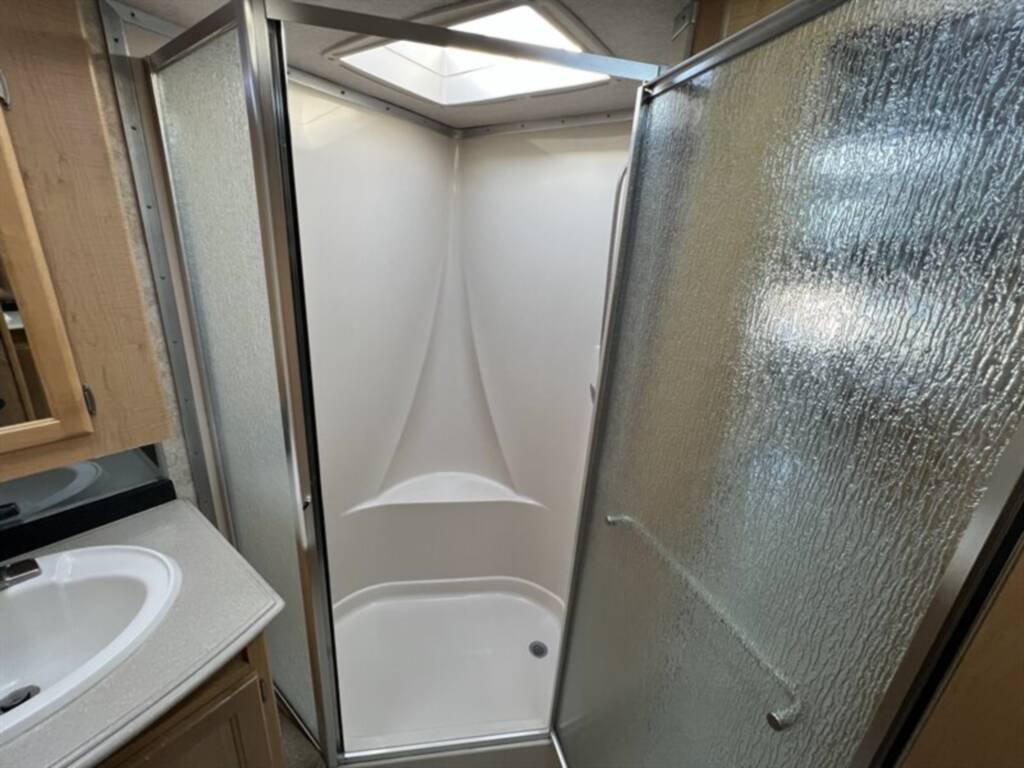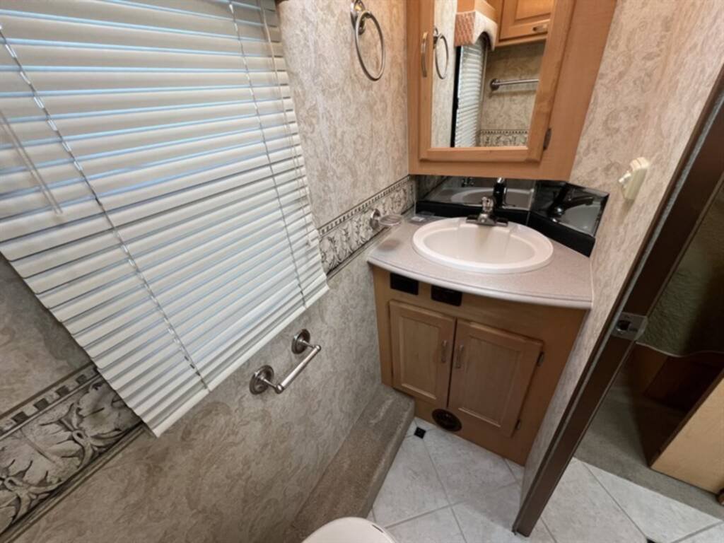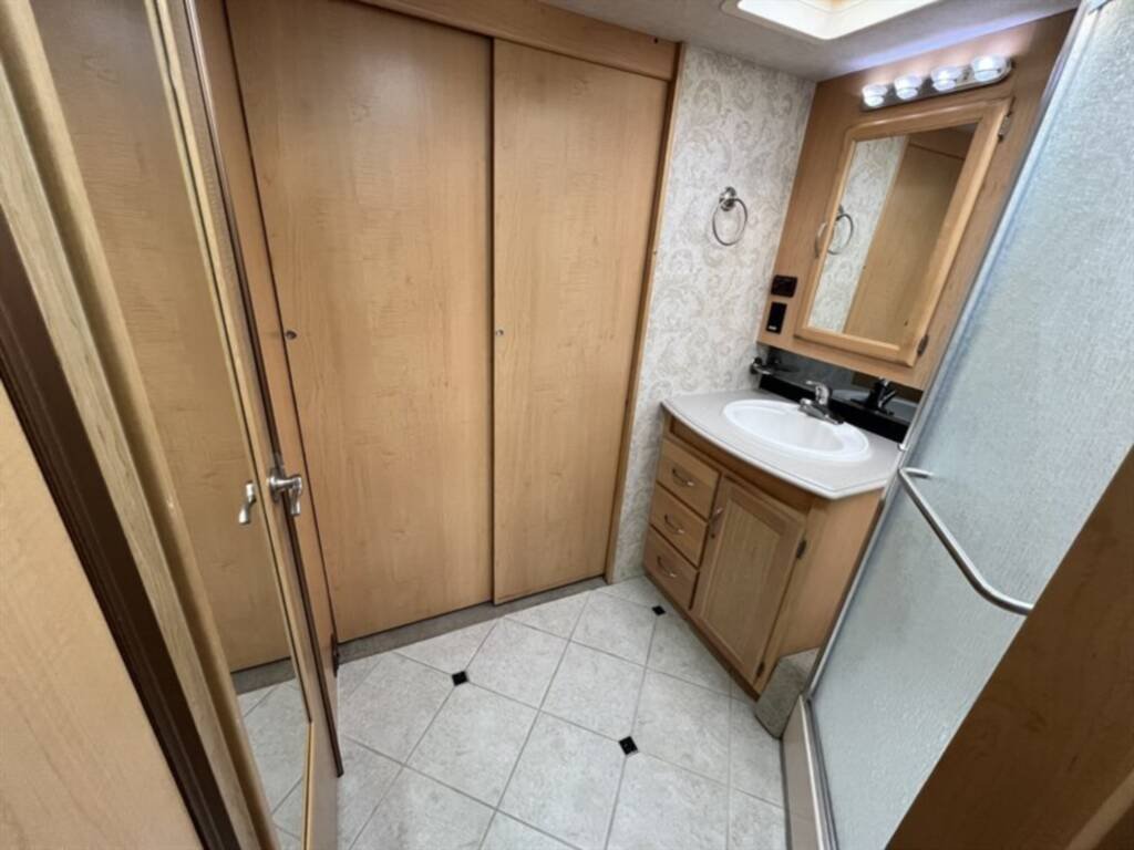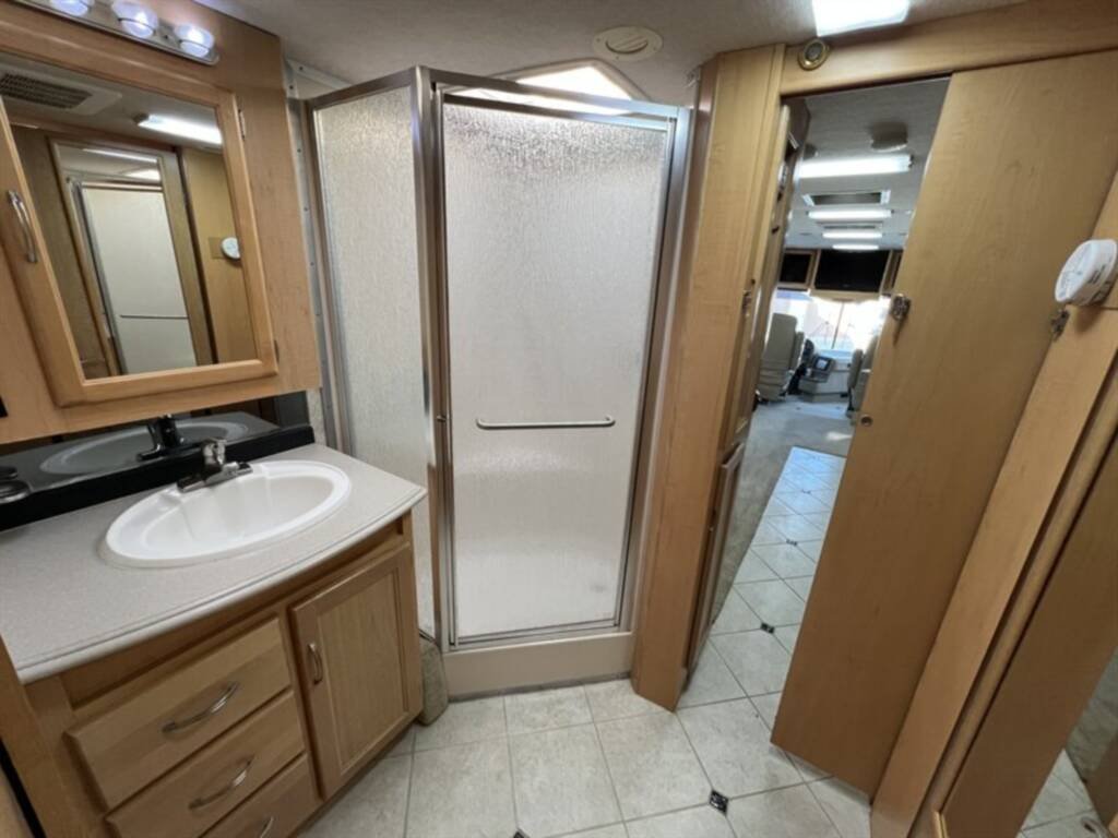 The split bathroom features a neo-angled shower with glass doors, a separate porcelain toilet room, and a wash sink with mirrored vanity, complemented by ceramic tile flooring. Dual ducted 13,500 BTU air conditioners and dual furnaces provide year-round comfort, while the home theater package includes two TVs, a DVD player, and surround sound. Day/night shades and a computer workstation enhance functionality, and the interior is finished with plush cloth ceilings and well-maintained upholstery.
