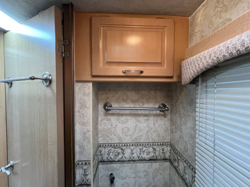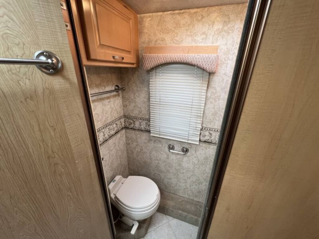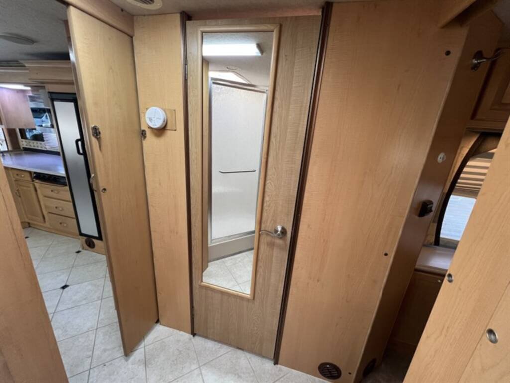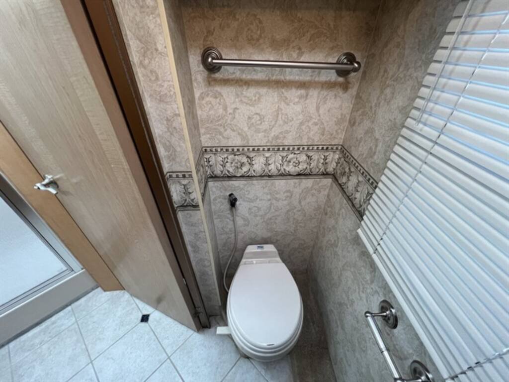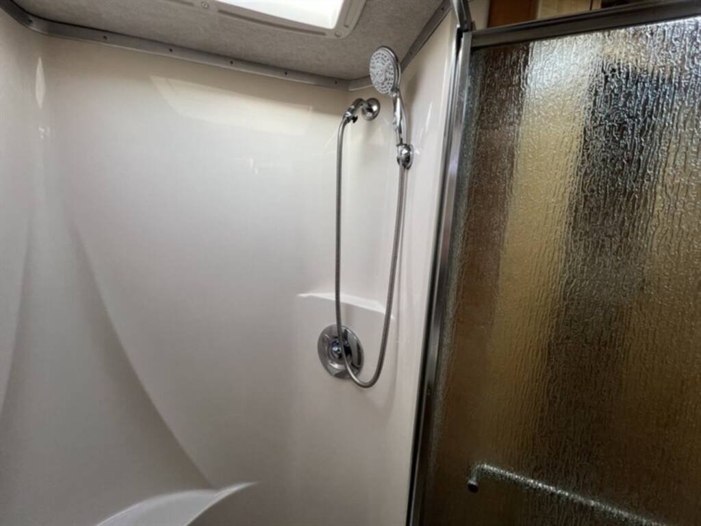 The split bathroom features a neo-angled shower with glass doors, a separate porcelain toilet room, and a wash sink with mirrored vanity, complemented by ceramic tile flooring. Dual ducted 13,500 BTU air conditioners and dual furnaces provide year-round comfort, while the home theater package includes two TVs, a DVD player, and surround sound. Day/night shades and a computer workstation enhance functionality, and the interior is finished with plush cloth ceilings and well-maintained upholstery.