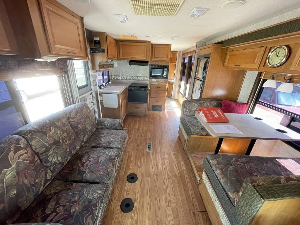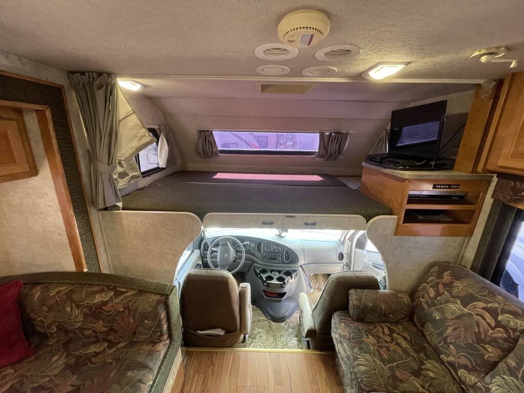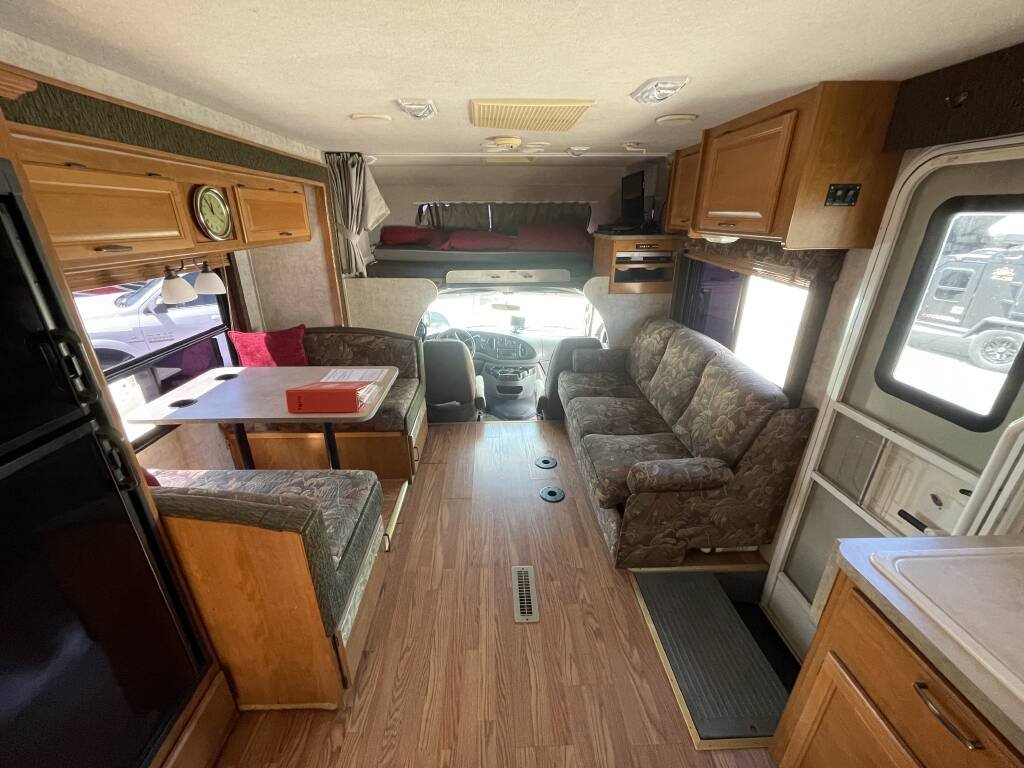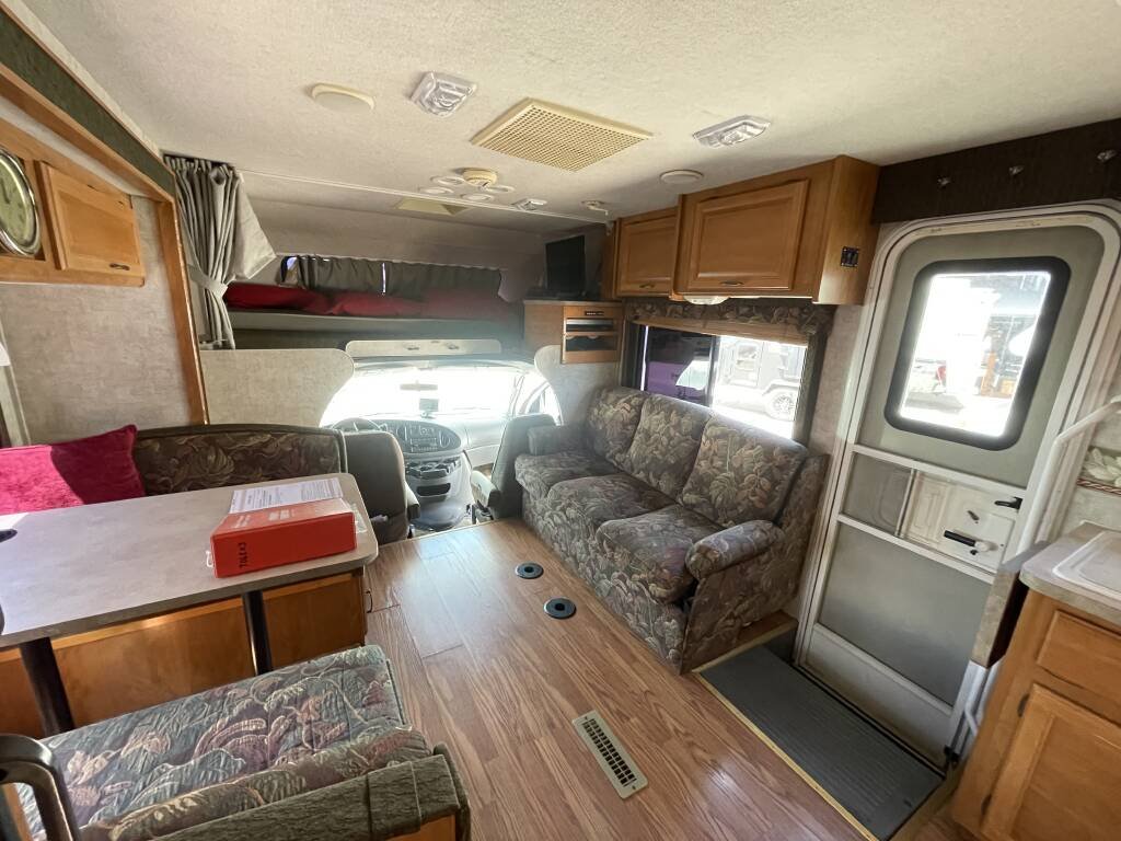 Built on a sturdy Ford E-450 chassis, the Tioga 31M features a fiberglass exterior in a timeless white finish, designed for both durability and aesthetic appeal. Measuring 31 feet in length, it offers ample living space while remaining easy to maneuver. Two slide-outs expand the interior, creating a roomy environment, and a retractable awning provides shade for outdoor relaxation. Generous exterior storage compartments make it effortless to bring along camping gear, tools, and essentials. The aluminum wheels and well-maintained tires ensure a smooth, dependable ride.
