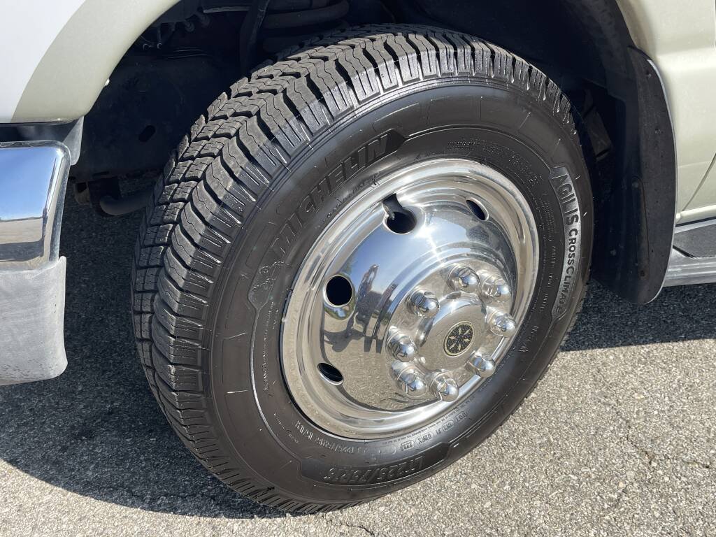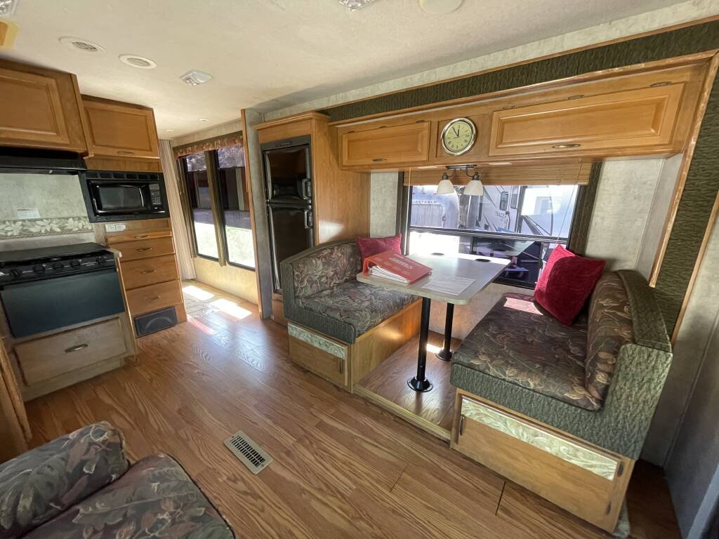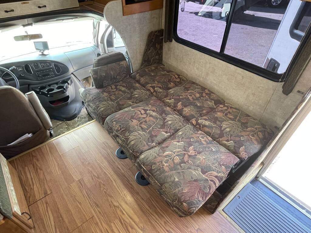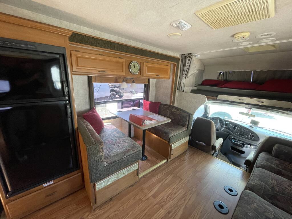 Built on a sturdy Ford E-450 chassis, the Tioga 31M features a fiberglass exterior in a timeless white finish, designed for both durability and aesthetic appeal. Measuring 31 feet in length, it offers ample living space while remaining easy to maneuver. Two slide-outs expand the interior, creating a roomy environment, and a retractable awning provides shade for outdoor relaxation. Generous exterior storage compartments make it effortless to bring along camping gear, tools, and essentials. The aluminum wheels and well-maintained tires ensure a smooth, dependable ride.
