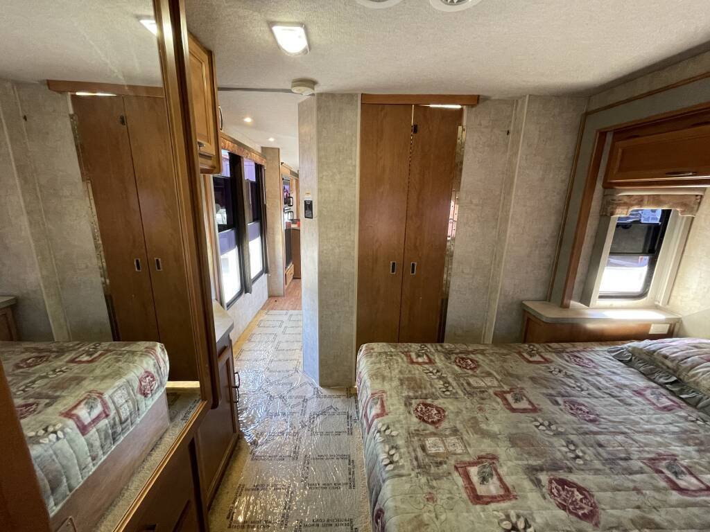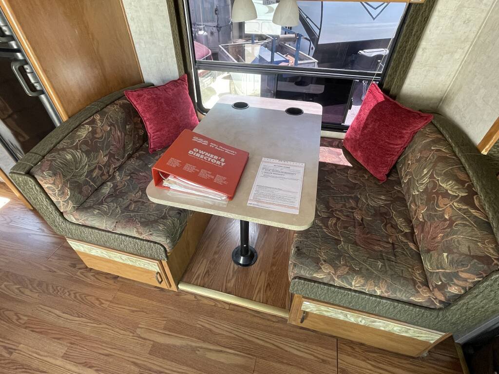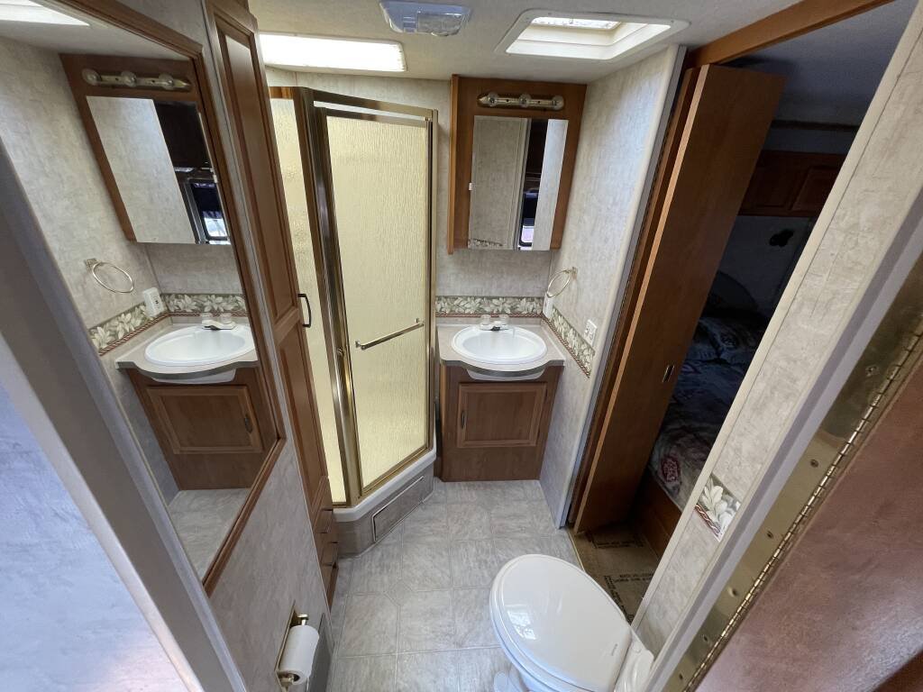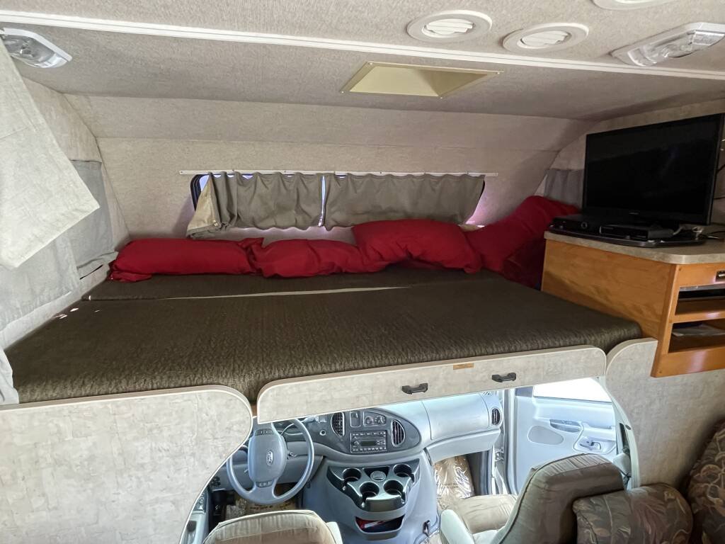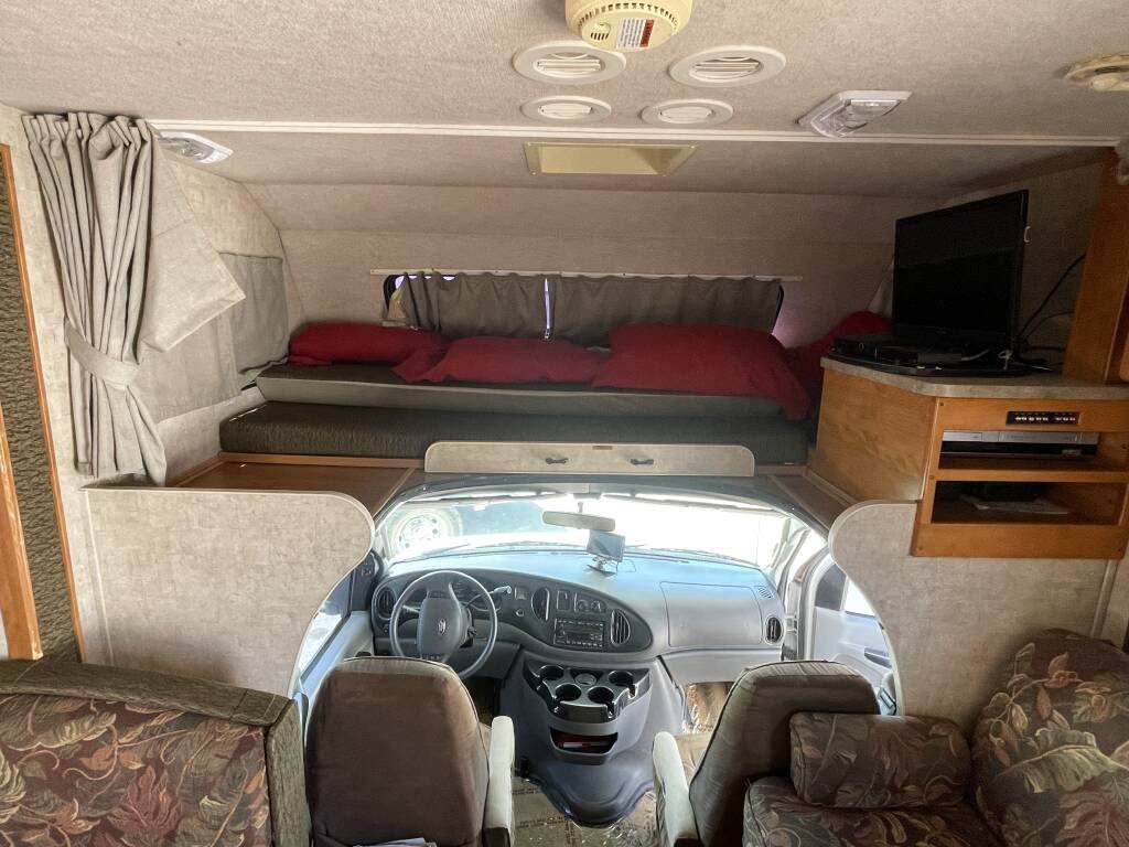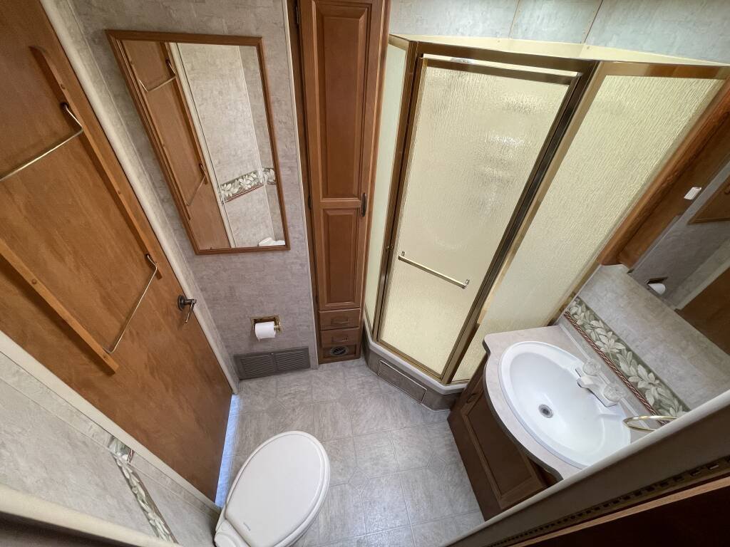 The bathroom offers a refreshing shower, toilet, and sink, with a water heater for warm showers after a day of exploration. A roof-mounted air conditioner and furnace ensure year-round comfort, while the entertainment system—complete with a TV and stereo—adds enjoyment to your downtime. The upholstery and flooring are in excellent condition, creating a warm and inviting atmosphere.