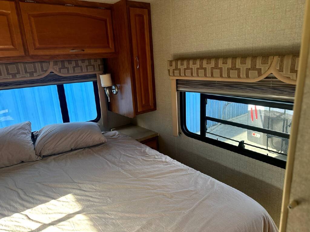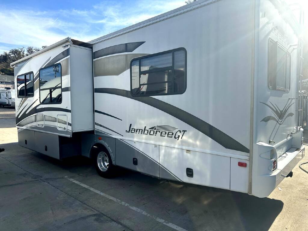 Crafted on a robust Ford E-450 chassis, the Jamboree GT boasts a fiberglass exterior with a sleek, aerodynamic design that shines in pristine white. Its 30-foot length strikes a perfect balance between spaciousness and drivability. A retractable awning provides shade for outdoor gatherings, while ample exterior storage compartments effortlessly accommodate camping gear and essentials. The aluminum wheels and well-maintained tires ensure a smooth and stylish ride.