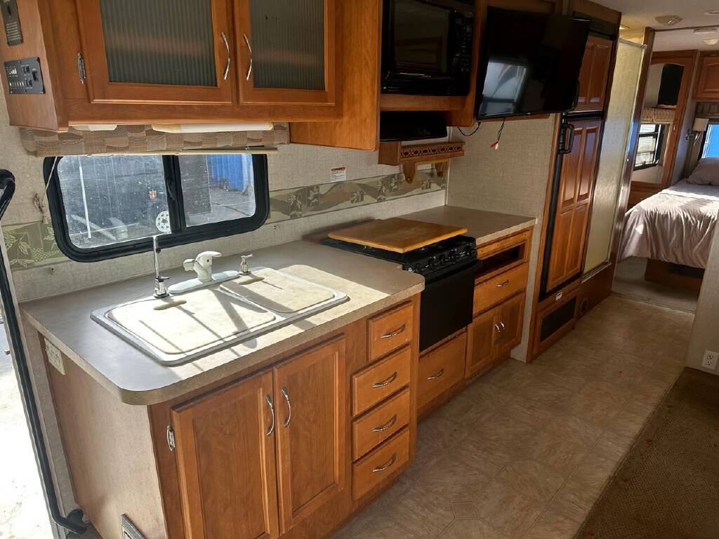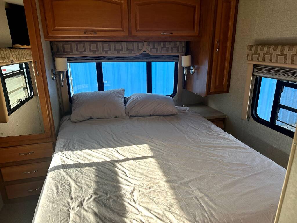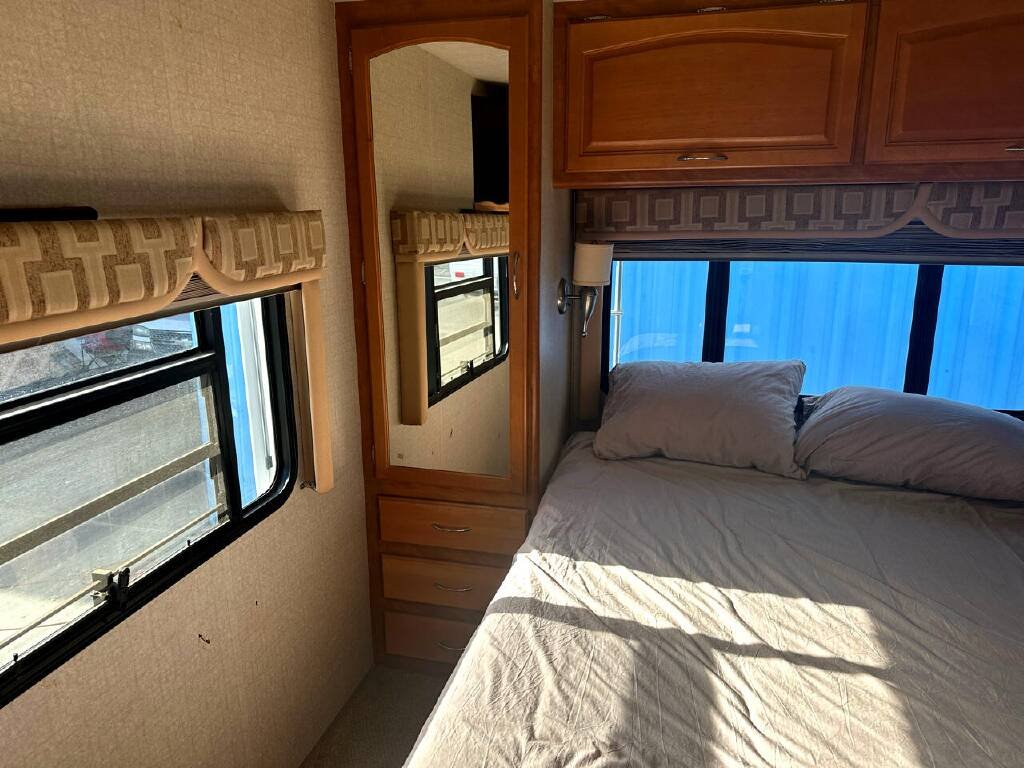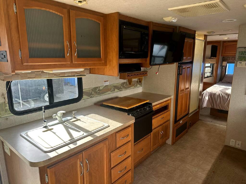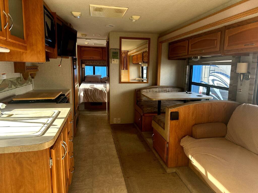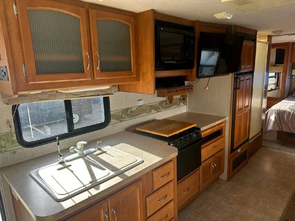 Powered by a Ford 6.8L V10 engine and paired with a seamless automatic transmission, this motorhome delivers reliable performance and effortless handling. The rear-wheel drive system ensures stability on diverse terrains. An onboard generator powers appliances when off-grid, complemented by a propane system for the stove, oven, water heater, and refrigerator. The freshwater, gray, and black water tanks are in top condition, and both house and chassis batteries are fully functional, ready for your adventures.