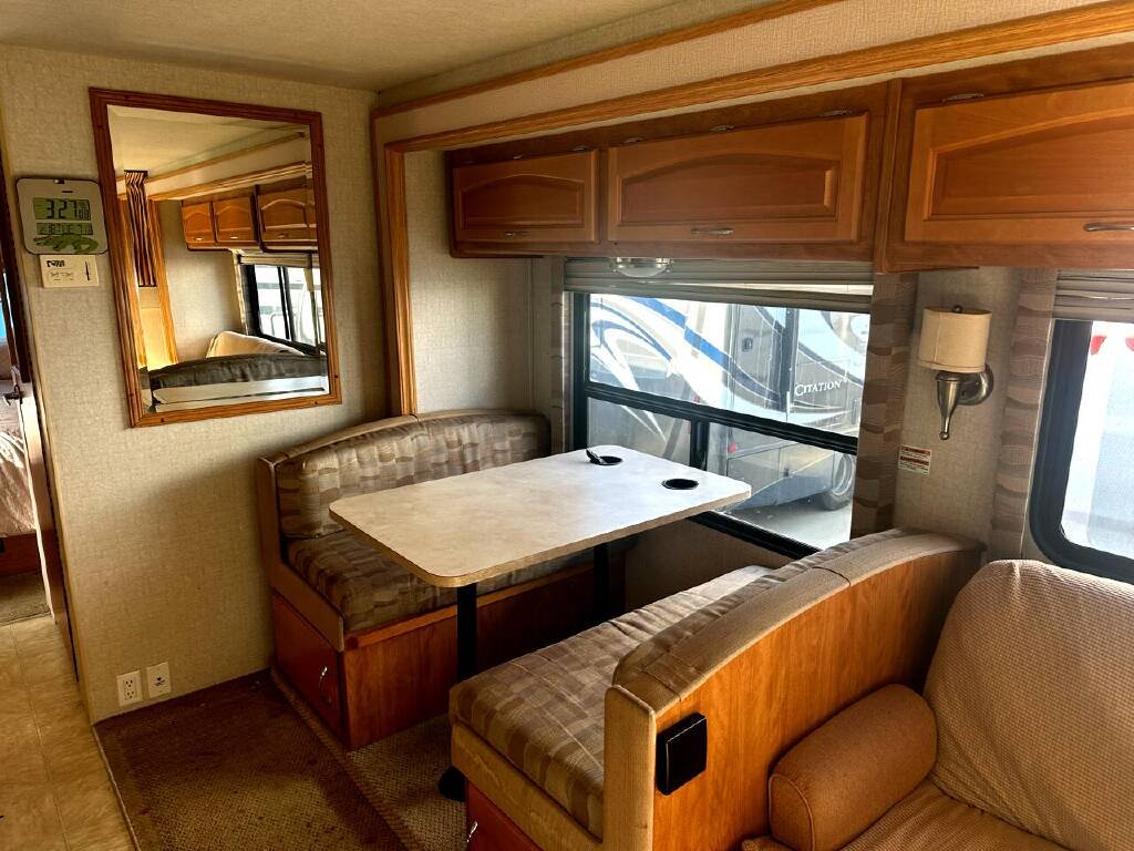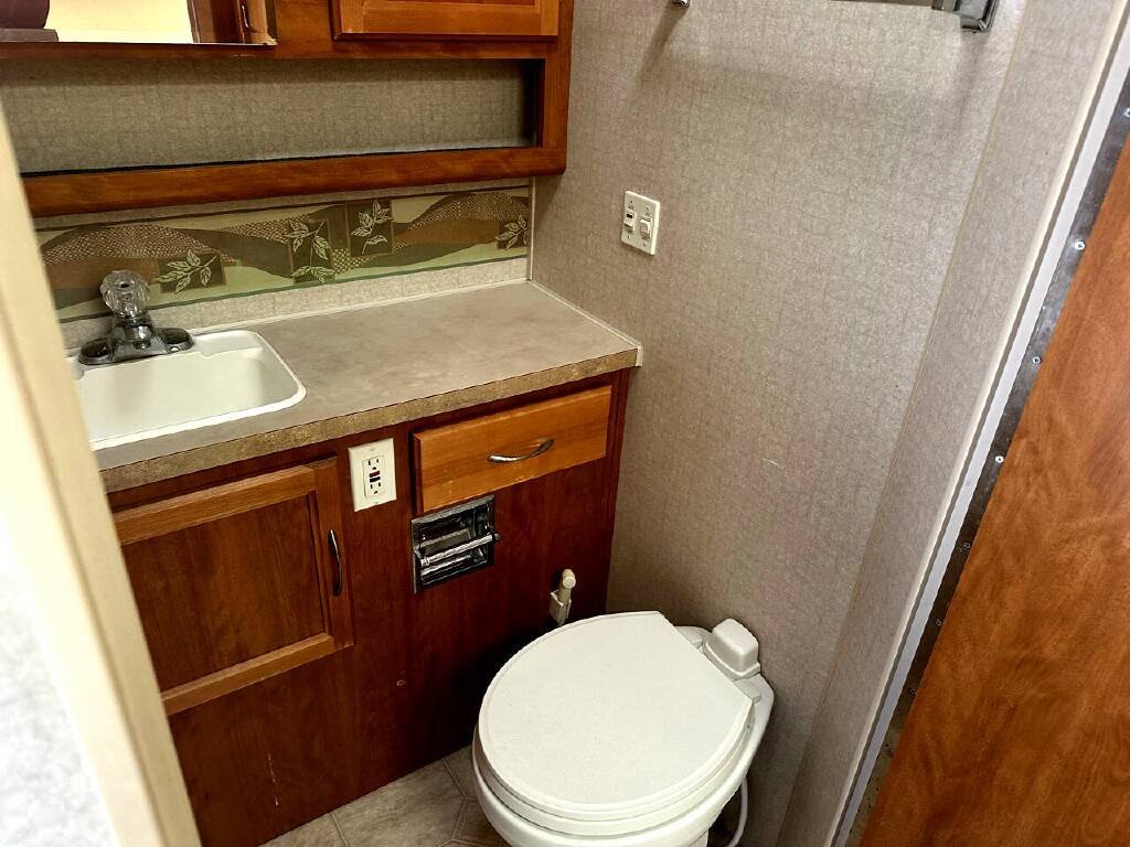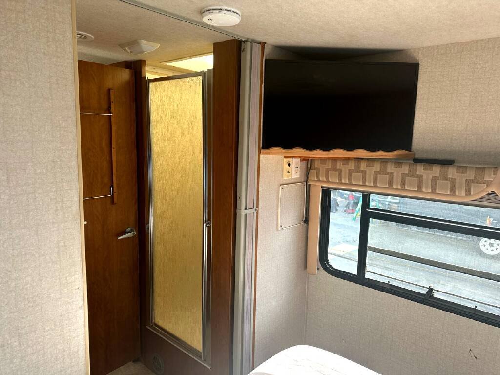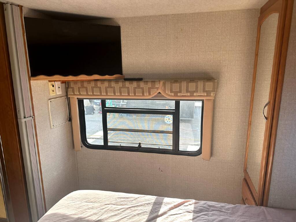 The bathroom offers a refreshing shower, toilet, and sink, complete with a water heater for cozy showers. A dinette transforms into additional sleeping space, and the entertainment system—featuring a TV, DVD player, and stereo—ensures fun-filled evenings. Stay comfortable year-round with a roof-mounted air conditioner and furnace, while the pristine upholstery and carpet add a touch of luxury.